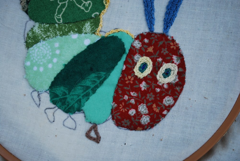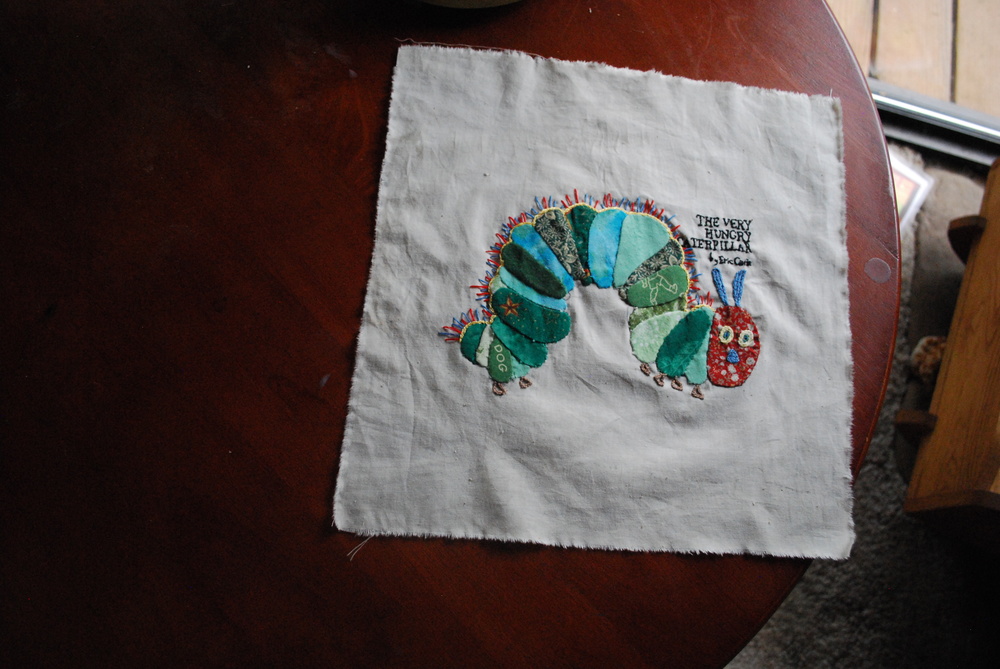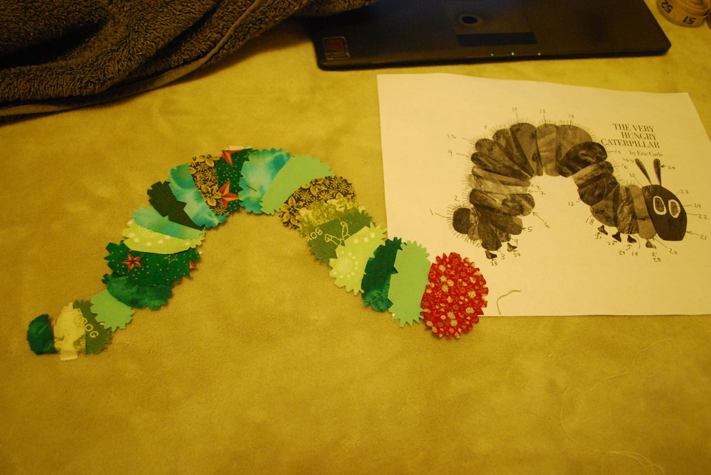 I wanted to replicate the collage feel that Eric Carle has in his illustrations, so I decided to do this with layers of fabric. If you look very closely at the cover of TVHC, he’s used overlapping pieces of paper–the different segments of the caterpillar’s body aren’t separate. I decided to do this with the fabric, too, to give it some interesting dimensions.