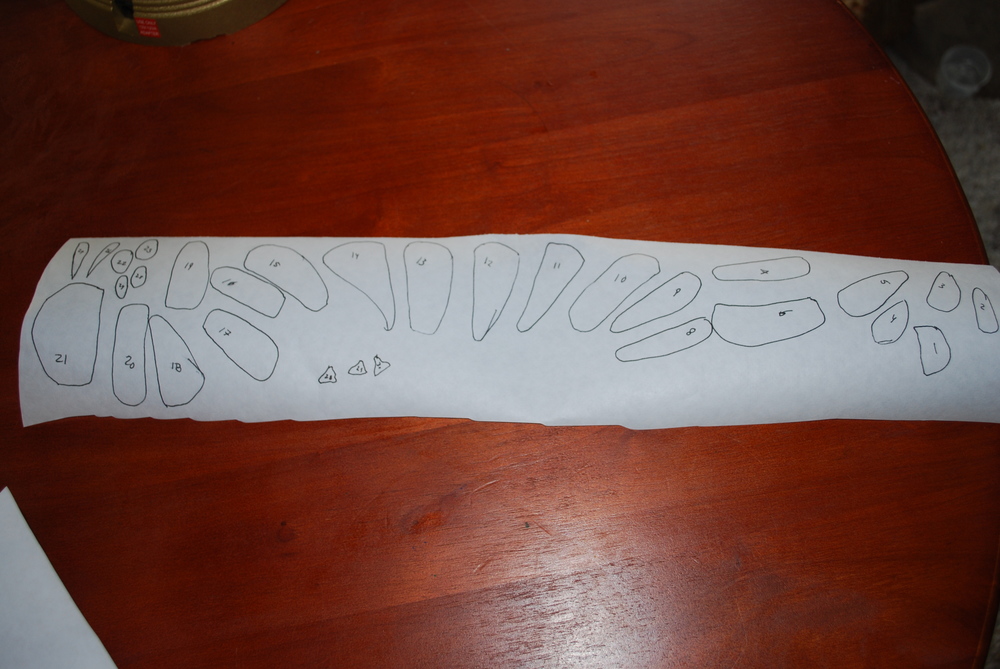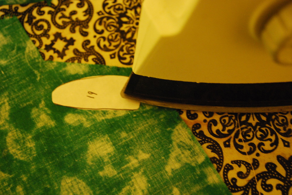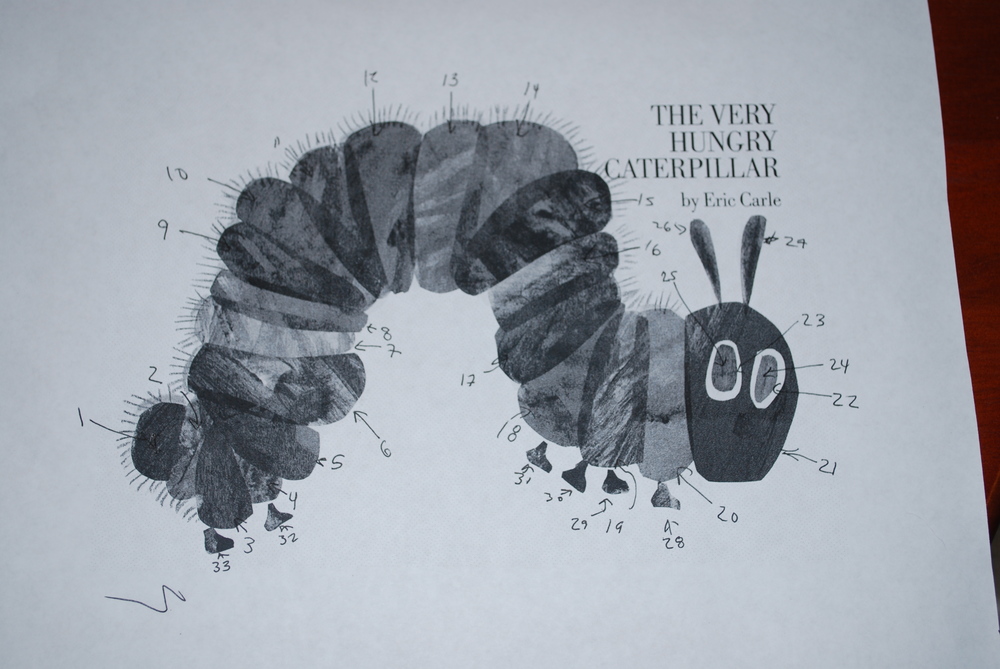 I began by climbing into my cluttered storage area to use my light table. If you don’t have a light table, a window would do. I took a print-out of the book cover and some freezer paper. I numbered each piece of the caterpillar on the print out, and then traced them onto the freezer paper, including the piece number. Keep in mind that the image will be the reverse of whatever you draw on the freezer paper, since you’ll want to draw on the rough side. I turned the cover image over so that I was able to trace it from the back.