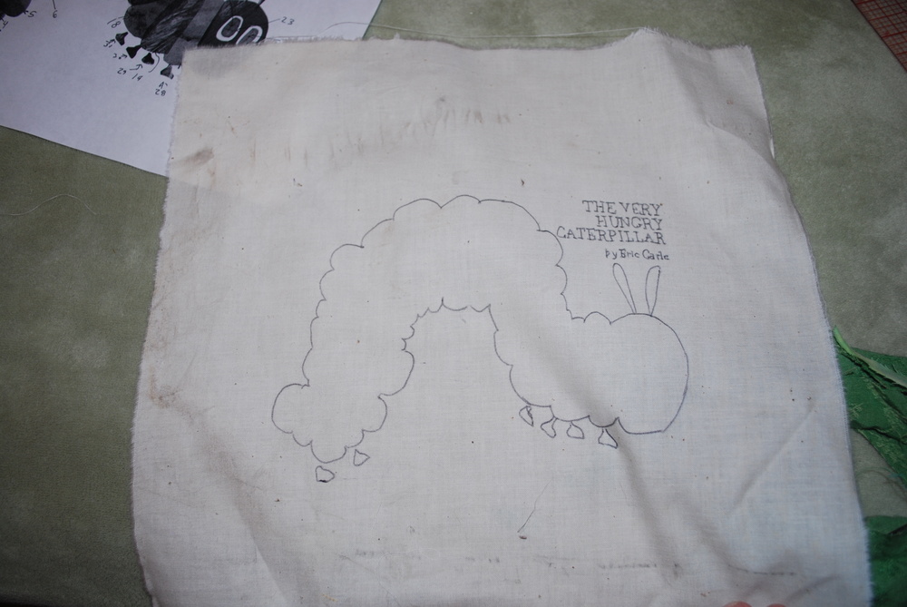 I traced the outline of the caterpillar, along with the text, onto a square of muslin. I could have–and maybe should have–traced all the individual pieces, but the outline served me well enough, and I found I didn’t need more than that.