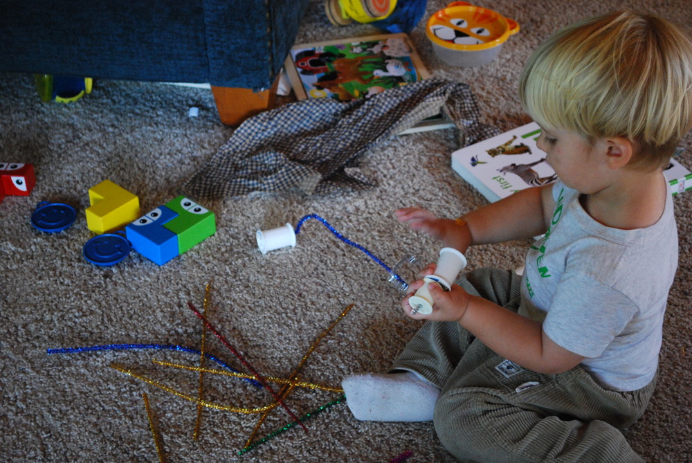 First of all, if you sew, can you save empty thread spools for us? I gave Silas a bunch of them, along with a pack of pipe cleaners, as a little birthday present. He played with it about as much as his “real” presents that day!