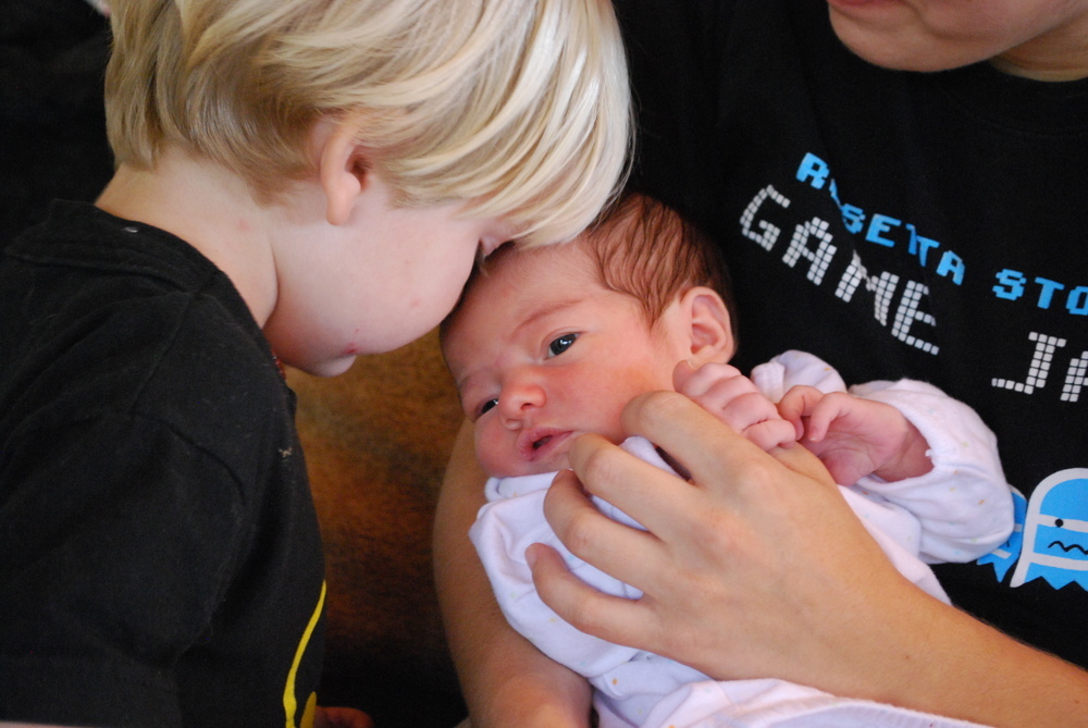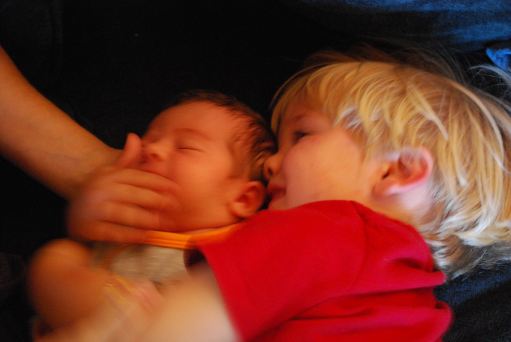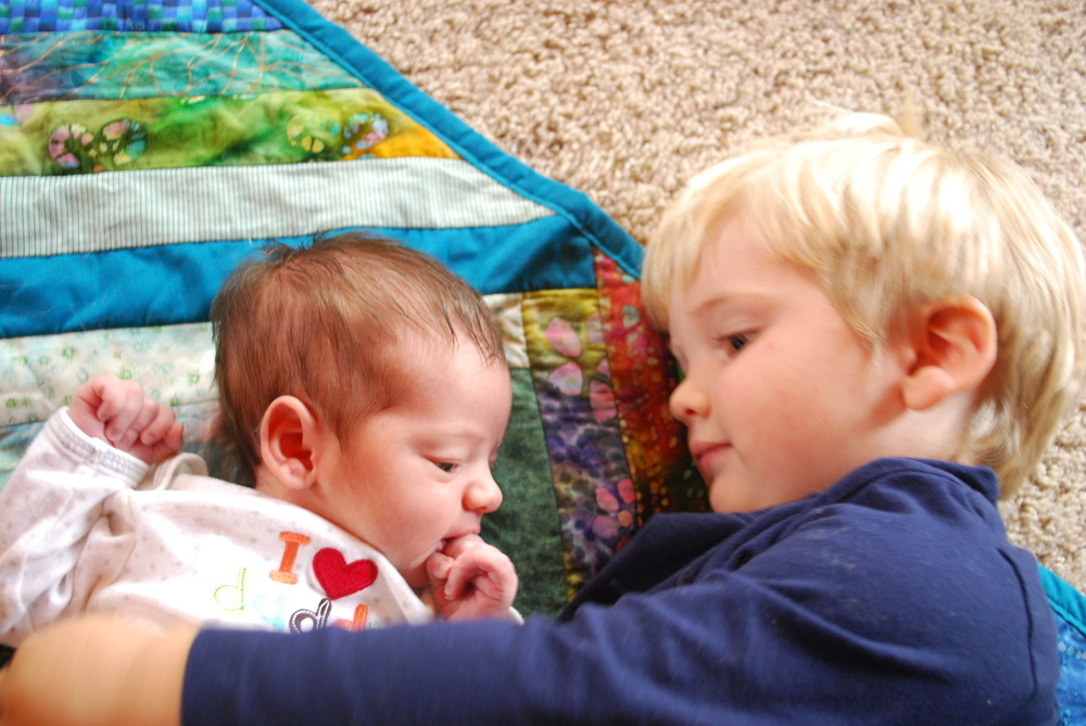 He is clearly very excited about her. He doesn’t seem to resent her or view her as competition. We make a big deal out of all the cool things he can do/have that she can’t (“No, sorry, Petra, babies can’t color with crayons. When you’re big like Silas you can.”). He frequently asks to lie down next to her on the couch or the floor, and wants to hug her. We let him hold her on the Boppy sometimes, too.