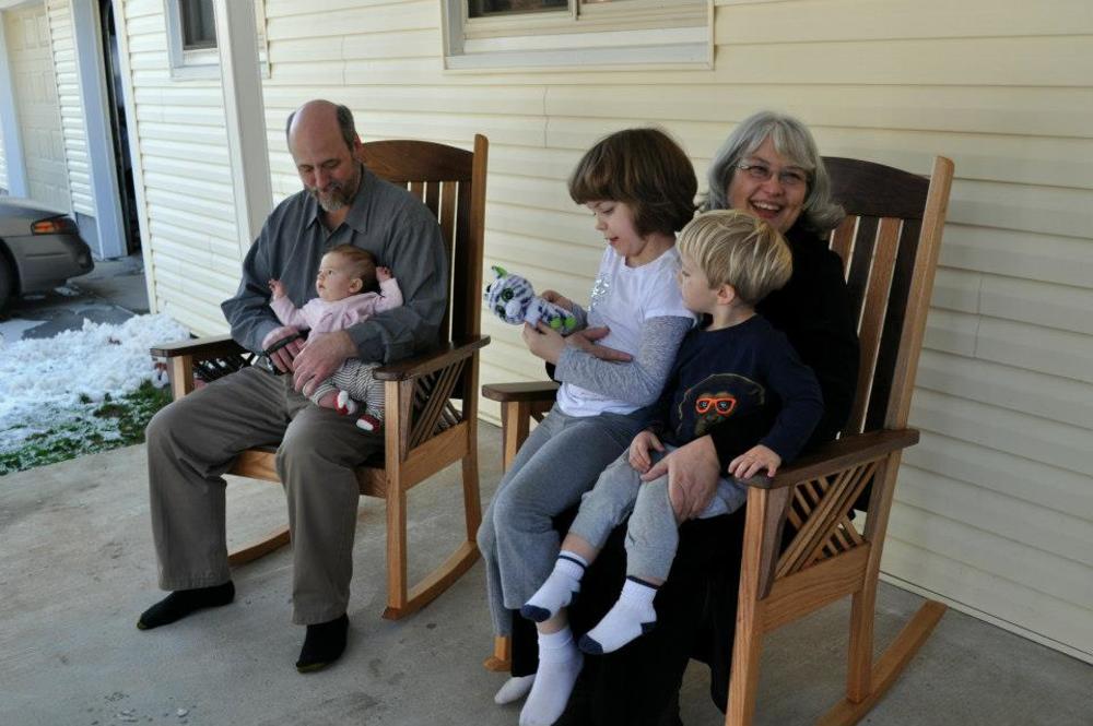 This year, all of JC’s siblings went in on rockers for his parents. His mom had asked for gift cards to buy rockers from Cracker Barrel, but … well, no. Sorry, but no. My mom has a rocker that was made just a few miles from where I grew up, in West Virginia, and she always gets compliments on it. She’s ordered a number of them over the years, as presents for various people, and she gave me the craftsman’s information. The business is Attaway Rockers, which, as far as I can gather, is just Tom Doak and his wife, churning out these beautiful rockers and porch swings. I have rarely had a custom ordering experience that was this detailed. Tom wanted to know about my in-laws, about their bodies (“Are they tall people?” “Not exactly…”), where they would be rocking (“Indoors or out?” “Both?”), how much room they would need (“There are some grandkids involved…” “Got it! A little extra room in the seat), and on and on. We asked him to use walnut and oak, since one of my sisters-in-law thought those were her parents’ favorite woods. How’s this for local–not only were the chairs made eleven miles from their home, the woods were all from West Virginia, too.