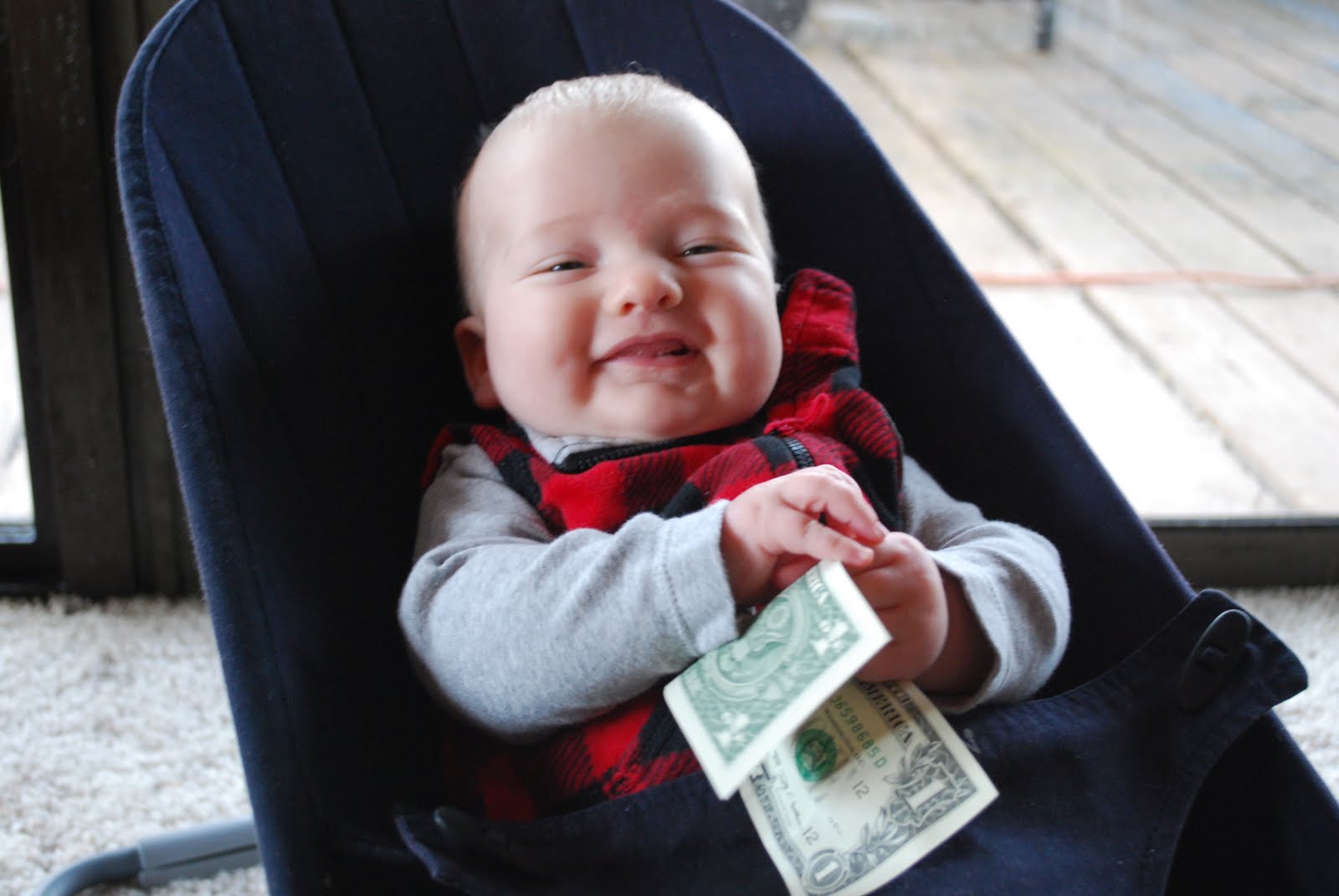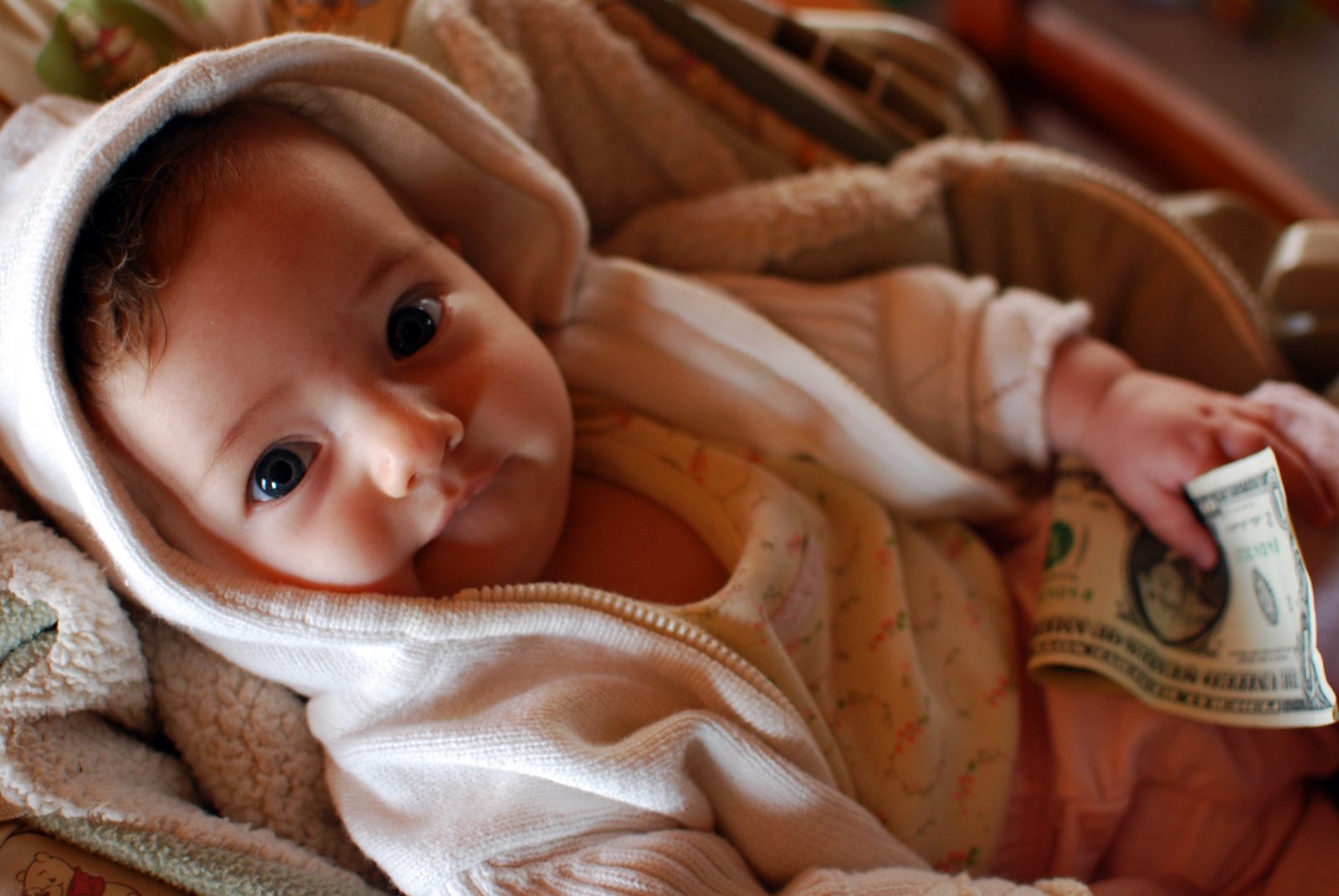 My family has an odd tradition, which my mother described in my baby book as “The Golding Tightwad/Spendthrift Test.” According to Granny (and please, correct me if I get the details wrong here, Gran), this goes back to the neighborhood where she grew up, in New York. At a baby’s christening party, someone would give her a dollar bill, and they’d time how long she held it. The length of time would indicate whether she’d be good with money (if she held onto it tightly) or she’d be a spender (if it “fell through her fingers”). I don’t know what the benchmarks are, here–what constitutes a good length of time? Is it just immediate dropping that indicates a spendthrift?