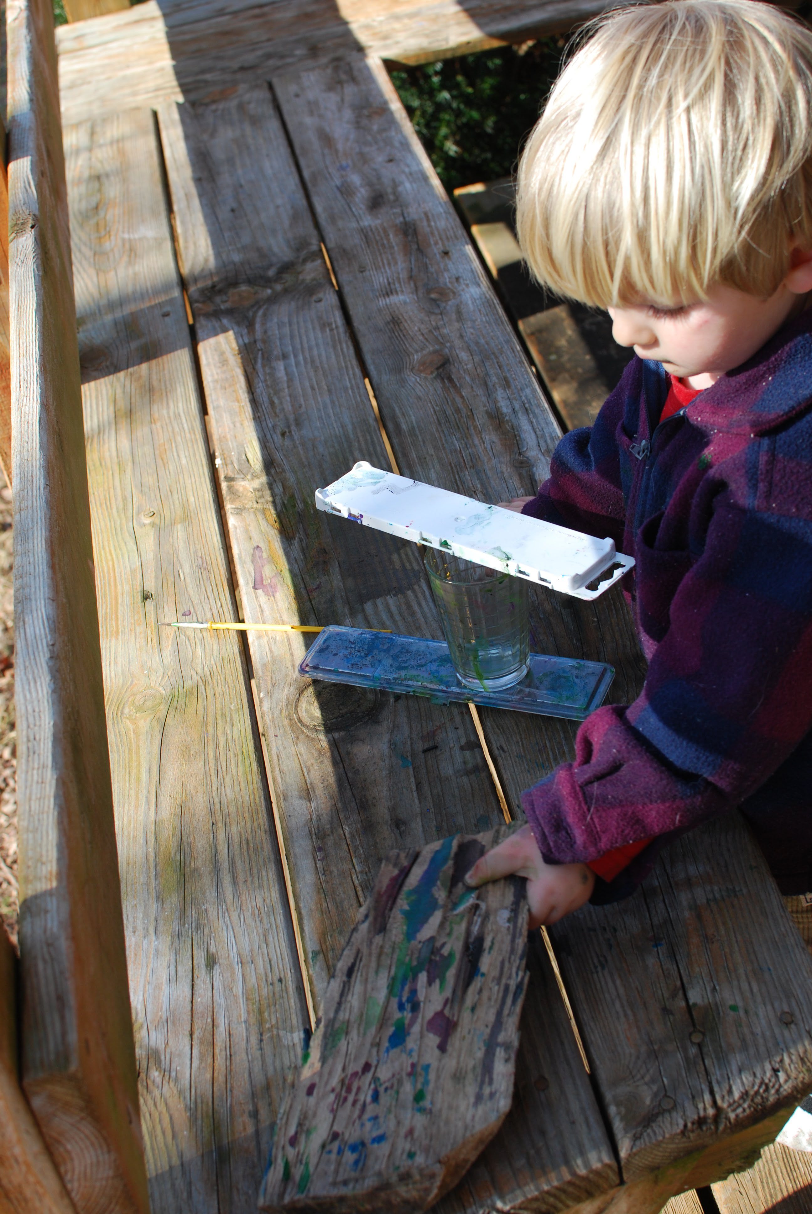 He’s working in watercolor, chalk and crayon. I convinced him to come for a walk with me, to take a break from coloring. He found this chunk of wood by the river, and said, “I’m going to take this home and decorate it for Grammie.” As soon as we got home, he asked for his paints. He spent at least an hour working on this. When he gave it to Mom, over a week later, he showed her the river, with rocks, fish, turtles, and other creatures.