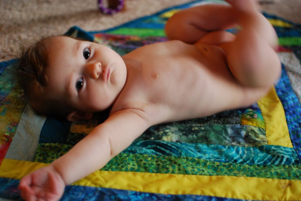 She clearly is ready to be off and running. She can roll both ways, when she wants to (rarely). If I put her on her belly, she starts moving her legs like she’s crawling–just needs to get the tummy off the floor, and off she’ll go. She loves to stand up and bounce around. I get worn out just holding her in my lap because she’s so wiggly. She’s this close to being able to sit up on her own, and is quite frustrated about that.