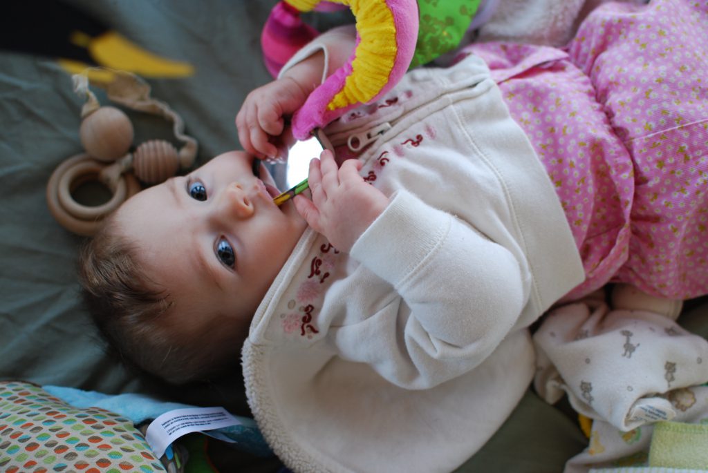 Petra is more into toys than Silas was at this age. She sees Silas playing with toys and wants to do what he does, but when he was her age, he wanted to do what we were doing. I think it’s incredible that babies know that they will be children next, that children are their people. Petra finally can grab things pretty deliberately, and so can express her preference for various toys.