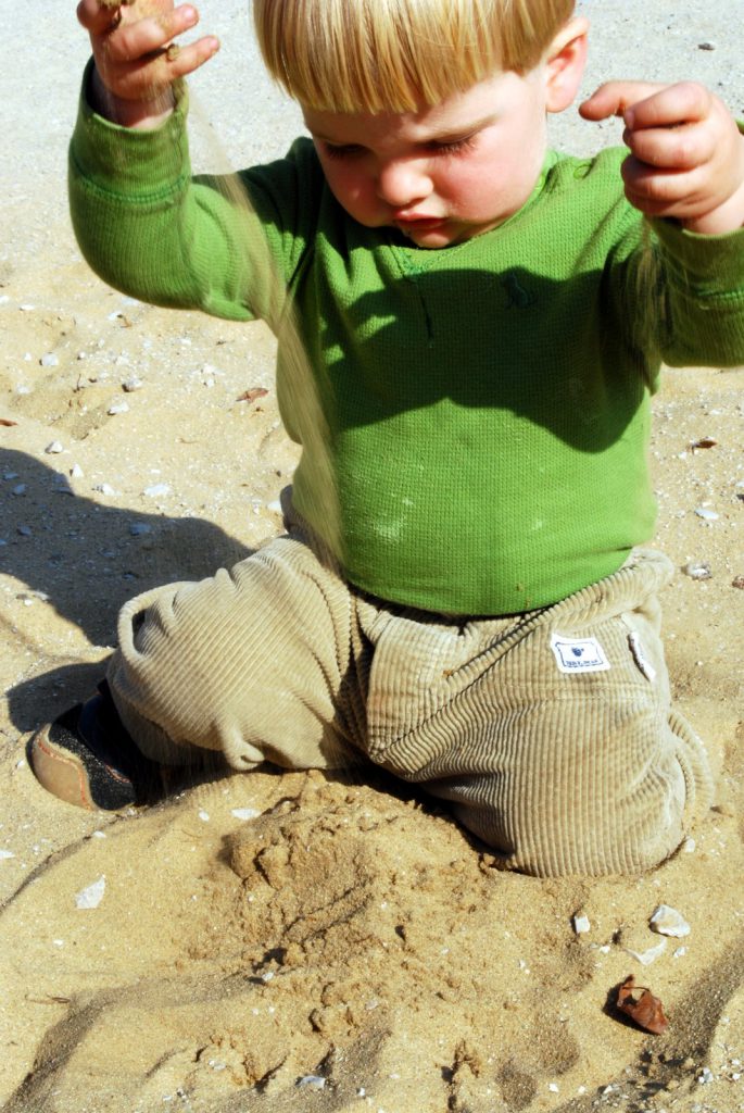 - Show him how to let it “rain” sand–letting it sprinkle through his fingers at 6″ above the ground, so he can still see it sparkle and fall, without it being high enough to get in anyone’s eyes.