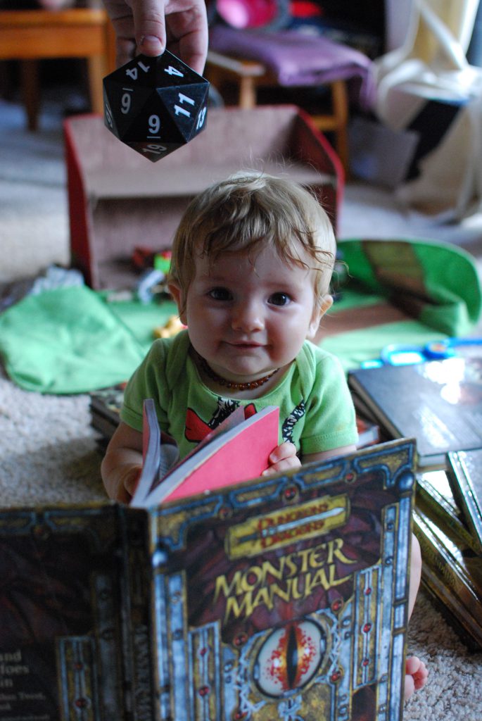 I know she’s on the brink of something BIG, developmentally. What’s going to happen this month? She’s not quite crawling yet; she’s in this stage where we put her down and she manages to be halfway across the room in no time, but it’s just scooting and rolling. I’m thinking she’s going to skip crawling and babbling and go straight to turning pirouettes and composing limericks.