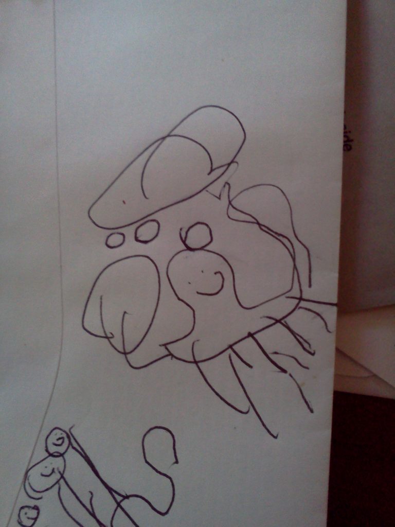 I just realized I haven’t posted much Silas art lately. The other day, he drew a juggling octopus that I thought was pretty good. He did this all by himself. JC says it looks like the octopus from The Great Mouse Detective, which he just watched.