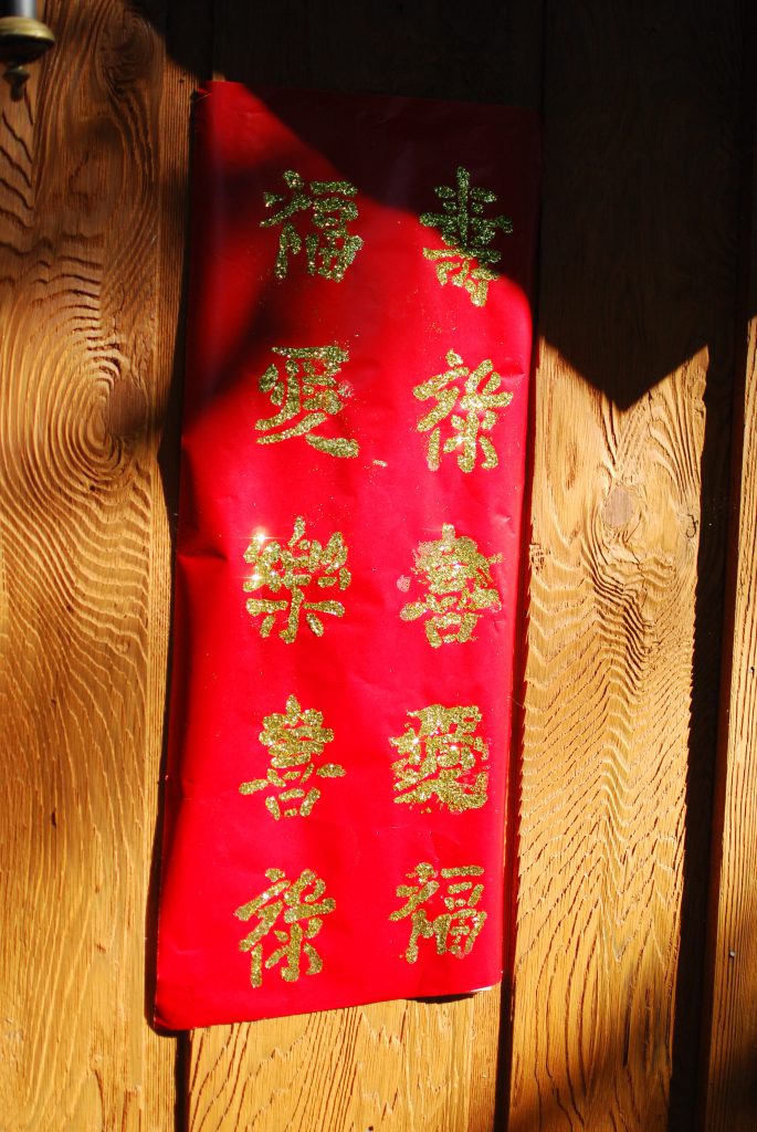 JC made this banner, using some stencils I found. In theory, it says things like “Love” and “Fortune.” I bet when an actual Chinese-literate person reads this, I will learn that it says “Shrimp and Mixed Vegetable.”