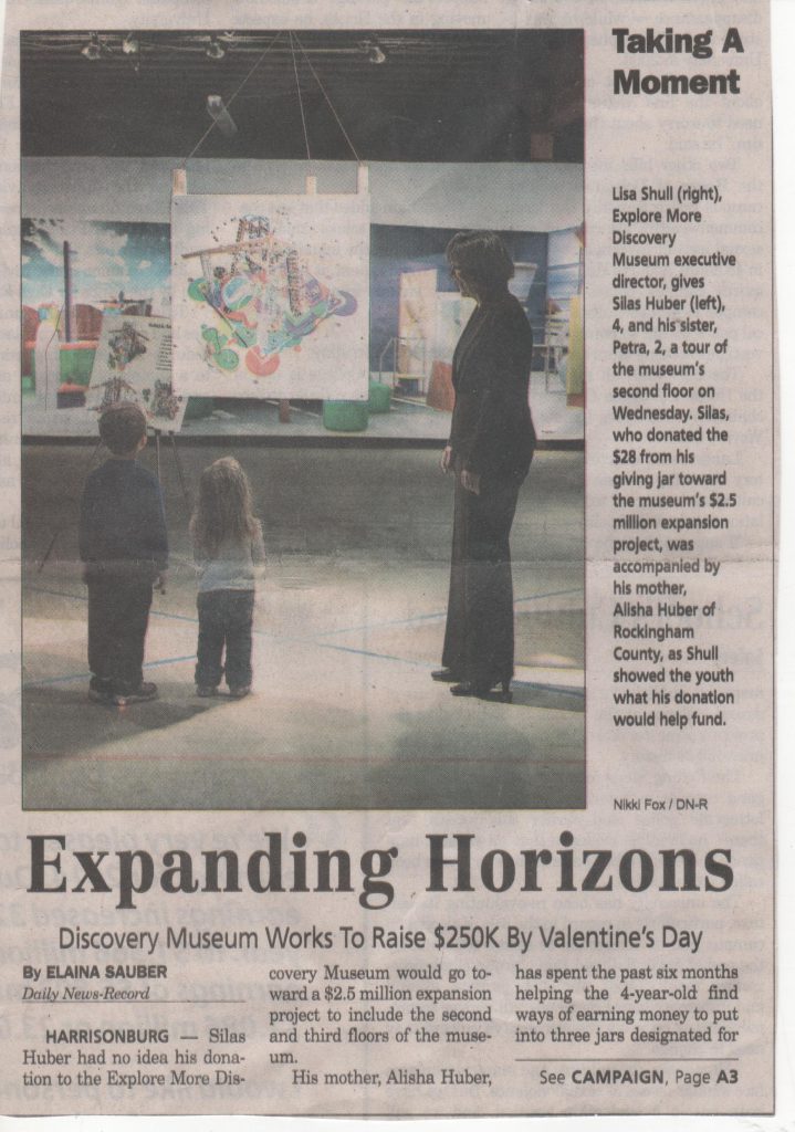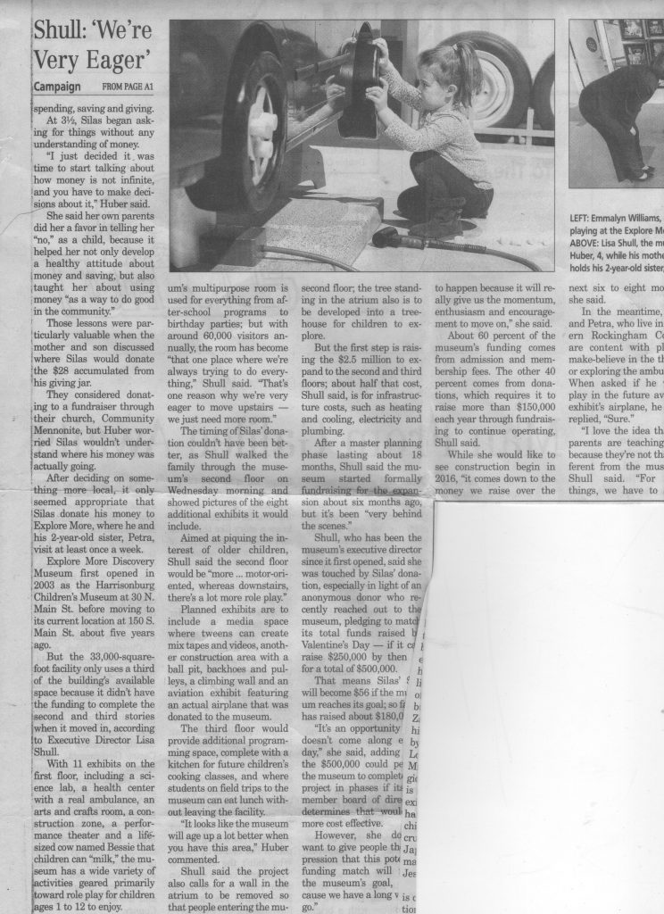 I was so happy that his first donation was a very positive experience for him. I want him to grow up with a sense of the responsibility to give back to his community and to help other people. Although I had originally planned on having him donate the money to our church’s fall “Penny Power” fundraiser for Mennonite Central Committee, I’m glad I rethought that. After all, money goes to church –> MCC –> some people in some foreign land who have a problem he doesn’t understand and won’t get to see, is way less concrete than, money goes to museum he visits weekly –> turns into exhibits he will touch.
