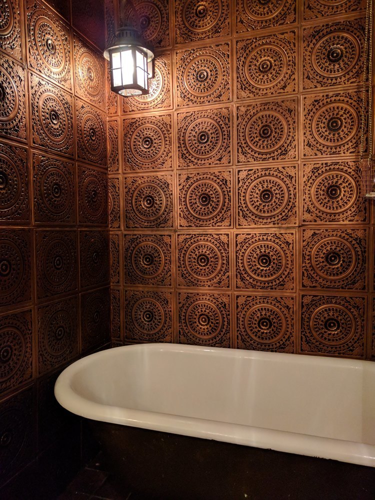 JC and I hung the drywall, I mudded and sanded and painted it. We found these tiles that look like pressed copper, but are actually made from recycled plastic. We hung those in the tub alcove.