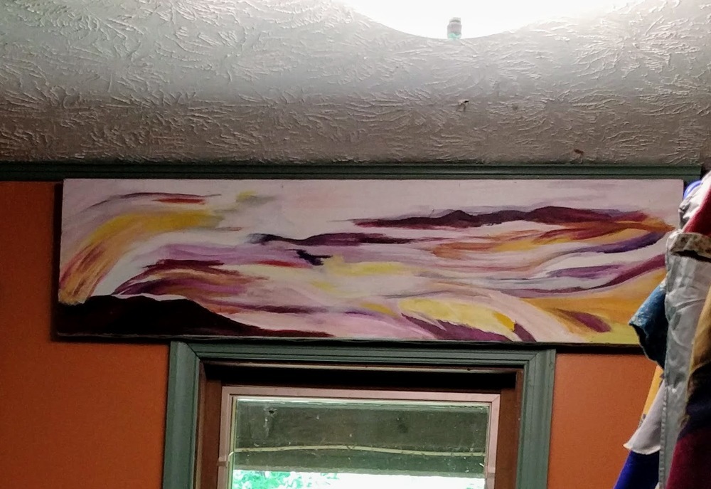 We did the tile and drywall into the adjoining laundry room, and even found a spot for the painting I rescued from my granny’s basement years ago. My mom made it when she was a teenager in New York. It looks like a Shenandoah sunrise to me.