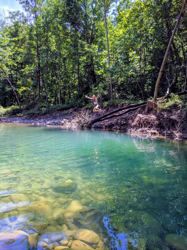 Lillian said, “There aren’t good enough words to describe how beautiful this is!” She’s right. In the deepest spots (I think at least eight feet), it’s deep turquoise. The water sparkles on it, and the shade shelters it. We’ve seen minnows and trout flashing in the depths. There’s a log that’s more or less safe for jumping off of (just avoid the root ball).