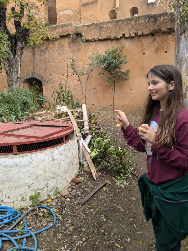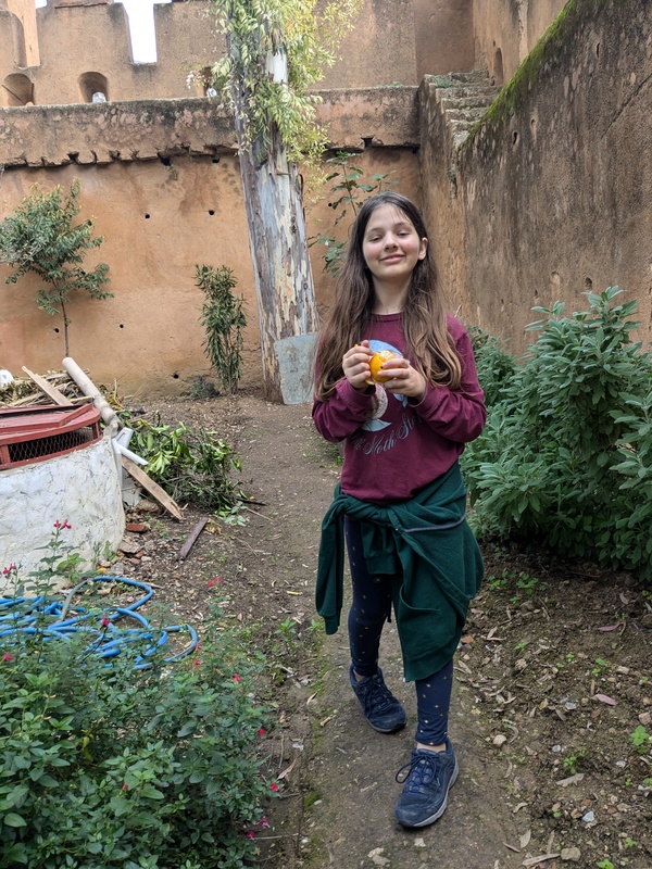 One happy discovery for Petra is that her favorite food—clementines—comes from Morocco! The “tanger-” part of “tangerine” is for…Tangier. I had no idea. So citrus was plentiful and inexpensive, and she ate as much of it as she could possibly desire, including one straight off the tree, tossed down to her by a gardener in the kasbah!