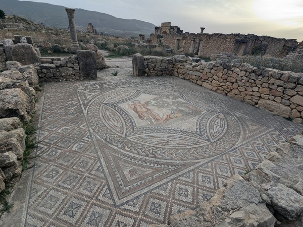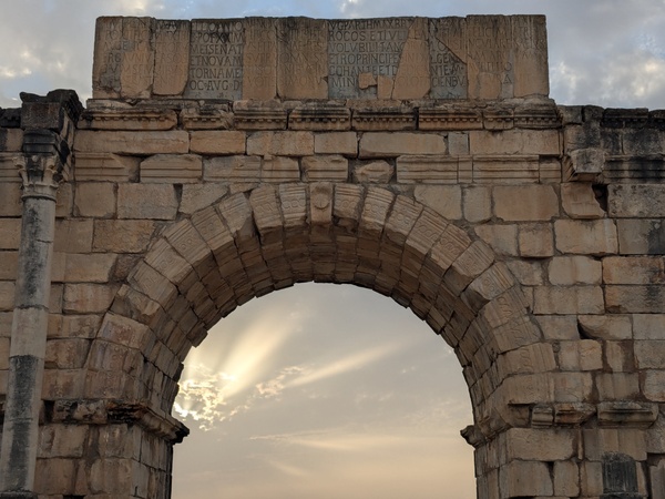 Let me back up—Volubilis is a Roman town that once was home to 20,000 people. After Rome fell, people left the city, bit by bit. For a time in the late 8th century, it was actually the capital city of Morocco. It was ultimately abandoned in the 11th century when the capital shifted to Fes. In 1755, when an earthquake devastated Lisbon, it also took out what was left of Volubilis. Randomly, just a few years earlier, a British ambassador had been there and had made many drawings of what he saw. In the early 20th century, French archaeologists began excavating the site and reconstructed significant sections, including the triumphal arch, part of the arcade on the main road, and part of the temple to Jupiter, Juno, and Minerva.