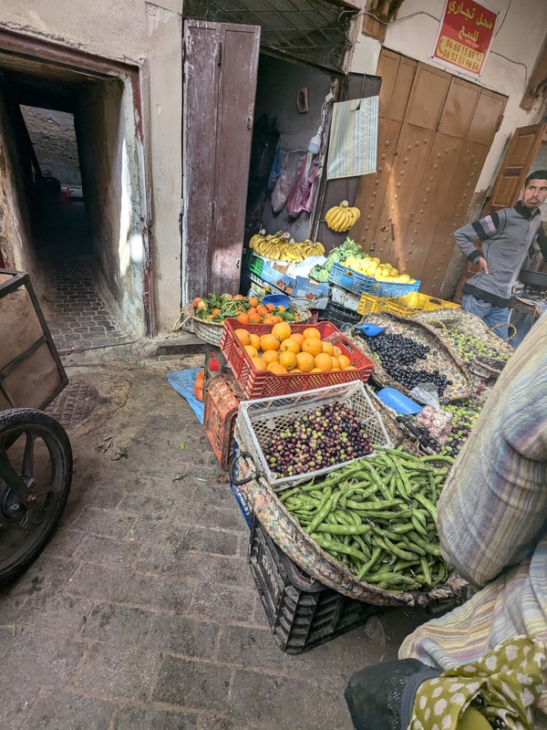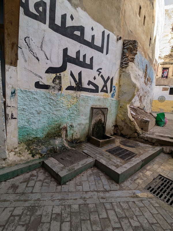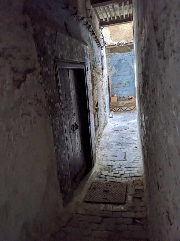 Our next stop in Fez was the medina. It’s famous for being old and confusing for outsiders. It was built in the 9th century, and is still very actively in use. At its center was an ornate mosque, originally one of the first universities, built by a woman named Fatima. We couldn’t go into the mosque—virtually all mosques in Morocco are only open to Muslims. We could look in through the doorways, though. It was gorgeous, filled with ornate carvings and tile.