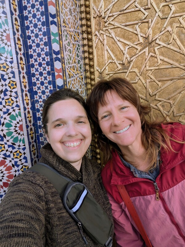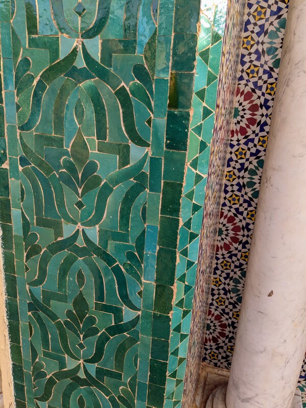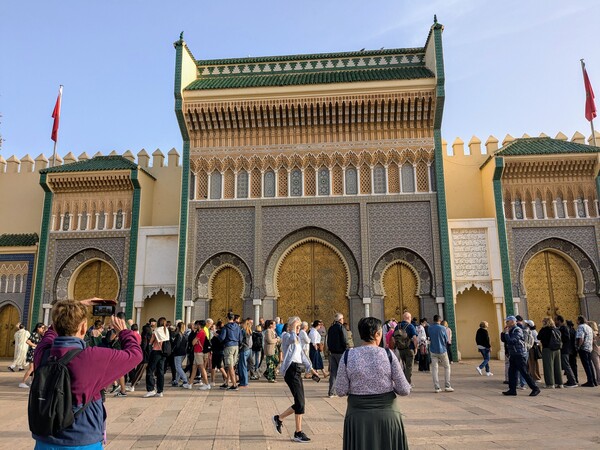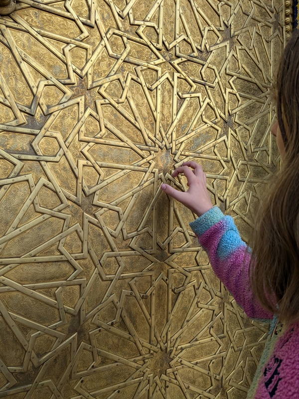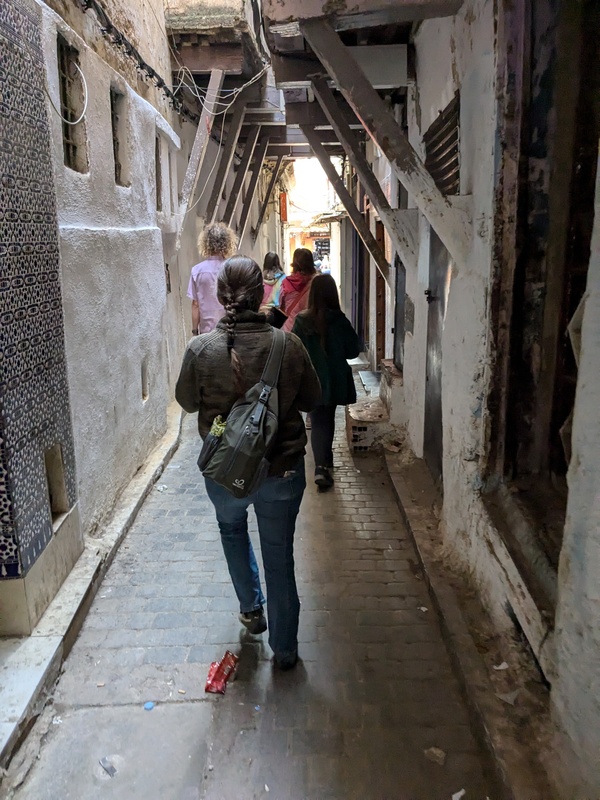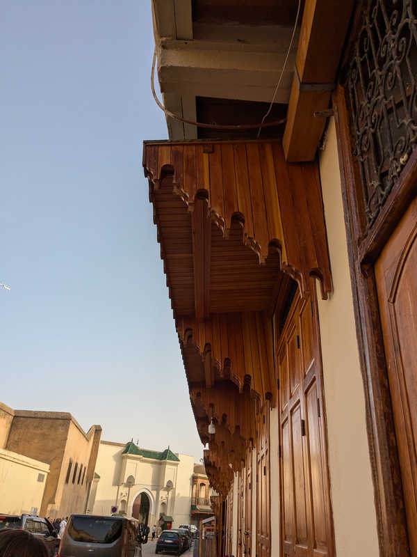 We explored the city with the help of Hmad’s friend Rashid, who works as a guide there. We started at the royal palace. The king has 19 palaces, each fully staffed, but mostly lives in Rabat. He only comes to Fez about once per year. The palace is not open for tours, even when the king is elsewhere, but tourists (us) come to admire the elaborate gate with seven doors, built in the 1960s. The tile work was amazing; virtually the whole gate was covered in mosaics with massive brass doors.