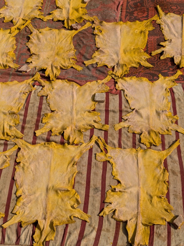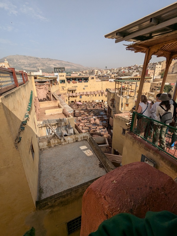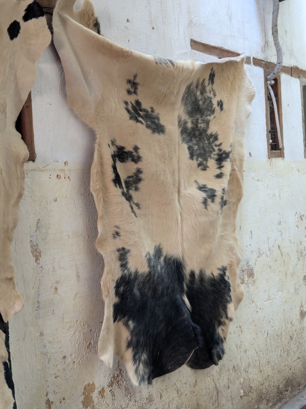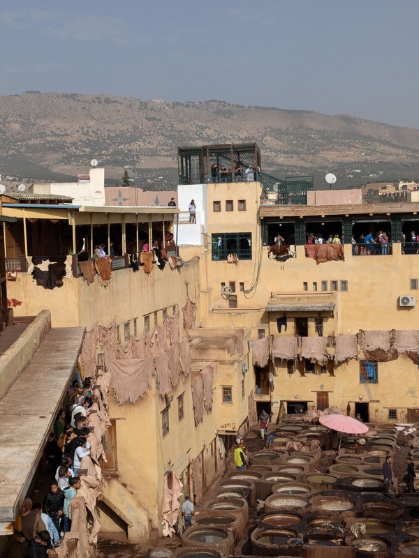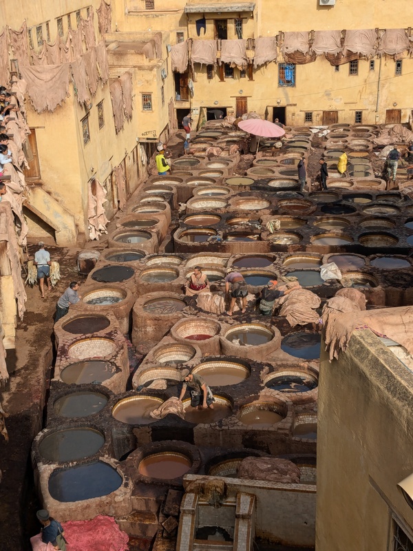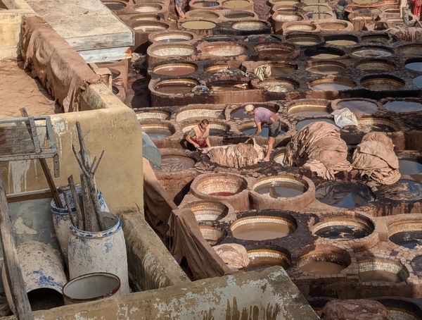 The tannery we visited in Fez has been operated by the same family, using the same techniques, for 600 years or more. A guide took us up through the shop to a balcony where we could see every step in the process. First, skins laid out to dry, staked to the rooftops or hanging from racks