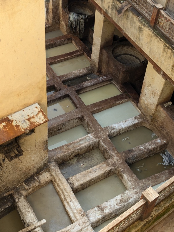 Then men standing in giant carved holes in a plain of rock, swirling skins in colored water. Some of these vats had urea and other chemicals to tan the hides; some had dyes. When I asked about the dyes (and whether it was safe for them to be just…standing in the dye water), the guide told me that the dyes are all plant-based, and none poisonous. Saffron, poppy, turmeric.