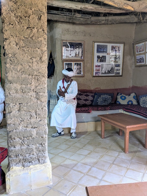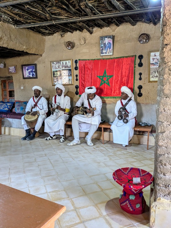 After lunch and the cooking class, we went to a nearby house where several Black men performed percussive traditional music. The group was called “Les Pigeons du Sable”—the Pigeons of the Desert. They shared about their heritage, drawing both from central and west African traditions as well as Moroccan influences. They had a djembe and a couple other drums that looked kind of like taiko drums, very loud clackers (they called them castanets, but they weren’t at all like what I think of), and a three-stringed instrument that looked like a cross between a banjo and a bass guitar (the musician played it amped). They did some dancing and singing as well as instrumental pieces, and, at one point, an older man got several of us into a circle dance.